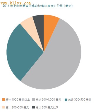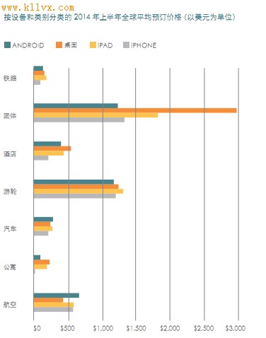 APP预订占移动端预订总量的12%。 不同设备在不同预订类别的交易额分布情况各异:在iPad上预订旅游套餐所花的费用比在任何安卓设备上的要平均高出600美元;但是,在安卓设备上的航班预订额比其他任何移动设备都要高。