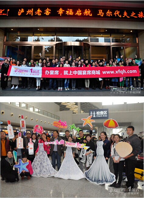 一站式办宴席,0元游马代? 记者观察到他们手中的小酒为泸州老窖的小头曲酒,带着疑问采访了部分参与者,了解到:三十位男女来自全国各地,本身互不相识,因为参与“幸福启航”活动购置婚宴用酒,幸运中奖而获得马尔代夫免费之旅。 而主办方为号称“一站式办宴席”的“幸福启航宴席商城”。为体现其宗旨“一站式办宴席”,主办方贴心打造一次浪漫马尔代夫旅行婚礼,而此行无论是酒店、旅行、婚礼、摄影等都无需三十位年轻男女任何花费,可谓意外之喜!