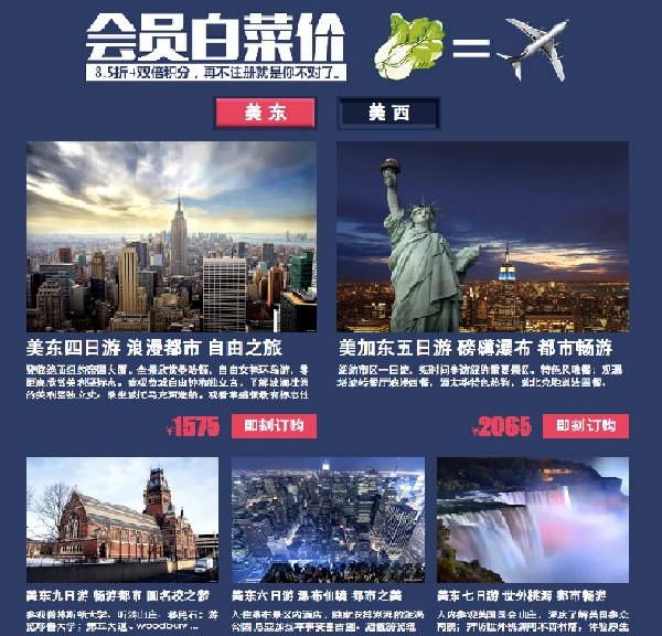 预热页面的上线,打响了旅游电商的双11大战。路路行在这次活动中主要分成两个环节。分别是:预热期(10月30日~11月9日)和正式期(11月10日~11月13日)。预热期会推出“双十一重磅剧透”活动,在路路行网站上订购,美国当地体验价一天只需188元人民币,可叠加。传统的普通旅行社,在此期间最大力度优惠也是10天至少仍需14500天人民币。而在路路行,10天只需188*10=1880元人民币,就可以轻松搞定美国10日行。所以真正意义上的1折出游,将从路路行的11月正式开始。同时,预热期,还推出了会员专享的优惠活动,只要成为路路行的会员,即可享受8.5折优惠打折,并赠送双倍的积分。 所以此次双十一的优惠力度可谓是空前的巨大。预热期之后就会接着推出正式期的活动。首先仍然保持着预热期间的¥188/天的一折出游优惠活动,然后还会推出刺激心跳的秒杀区,一天四个产品的心动秒杀,抢到就是赚到了。更多产品还可以享受到8.8折的优惠促销,并且还会有会员专场的强劲折扣。