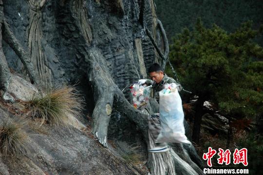 游客乱扔的饮料瓶 韩峰 摄 12月16日清晨,湖北罗田县天堂寨景区景点沿线寒风阵阵,山中气温已降至零度以下。几天前,大别山迎来初冬的第一场降雪,融化的雪水在悬崖峭壁上凝结成冰。 此时,在寒风凛冽的哲人峰观景平台下,景区清洁工毛勤志小心翼翼跨过岩壁上的灌木丛,接过从同事手中抛下来的绳索,系在腰间。他从近十米高、倾斜近70度的岩壁上穿过,来到石壁下方清理游客扔弃的矿泉水瓶和雨衣。 清理悬崖边垃圾的工作异常艰难。在毛勤志弯腰捡起垃圾的一瞬间,杂乱的灌木丛枝条在他的脸上划过,留下了一道血迹。由于常年要在灌木丛中穿梭清理垃圾,毛勤志被同事们戏称为“野猪”。 “有点害怕,毕竟掉下去就没命了,但是为了清理垃圾,只能硬着头皮上。”清理完哲人峰悬崖下的垃圾,毛勤志的头发和眉毛上结下了厚厚的冰霜,手指也冻得通红。 据悉,天堂寨主峰海拔1729米,核心景区线路长达10公里,徒步上下山需近6个小时,乘坐索道往返也需近1个小时。由于线路长,垃圾分散,景区的60多名职工早上7点就得上山开始清理工作,下午5点才能结束工作。一天下来,能清理近百袋垃圾。 天堂寨景区负责人韩峰告诉记者,天堂寨景区一年的游客数量达50多万人次,许多游客随手将垃圾扔在了路边,被风吹到石壁下和草丛中,平时很难被发现。冬季山上植被枯萎,白色垃圾逐渐显现。 “虽然清理垃圾的工作很危险,但为了给游客更好的旅游体验,我们吃再多苦也是值得的。同时,我们也要呼吁广大游客文明出行。”韩峰说。 (刘党生 付宇飞 周思龙) |
