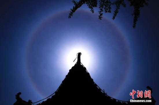 5月4日,在山东枣庄市山亭区拍摄的美丽日晕。当日11时起,山东枣庄市山亭区出现罕见的“日晕”奇观,蓝色的天空中太阳被一个巨大的彩色光环圈住,绚丽多姿,蔚为壮观,持续时间超过3.5个小时。据当地气象部门介绍,本次日晕天象所呈现的“圆周”之大、持续时间之长十分罕见。中新社发 刘明祥 摄 图片来源:CNSPHOTO(来源:中新网) |