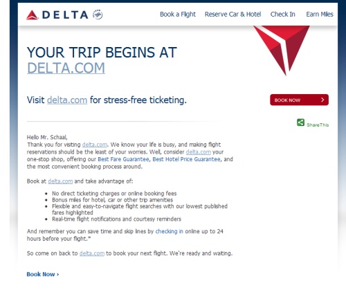 这是一项很聪明,而且很实际的营销策略,特别是匹配Orbitz的价格保证政策,它规定,如果其他Orbitz消费者以更低的价格预订了和你一样的航班或酒店,Orbitz将退还差价。 在电子邮件营销方面,达美航空公司(以下简称达美航空)也不甘示弱。它在发给SkyMiles会员的邮件中,主题开门见山的督促他们回到达美航空的网站,并在正文中指出“轻松浏览达美航空的优惠票务信息。”