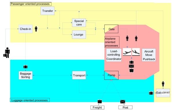 枢纽机场的地面操作分为三个独立的业务流程,飞机操作流程、旅客操作流程和行李操作流程。飞机操作流程和旅客操作流程的对接口在登机门,飞机操作流程和行李操作流程的对接口在机坪。每一个流程都需要相应的设施、设备和人员的协作才能够完成。飞机操作 |