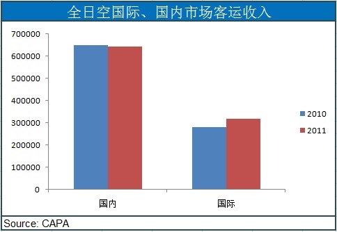据亚太航空中心报道,欧洲一些经济体的航空公司正经历着经济衰退所带来的切肤之痛,运气不好的直接关门歇业,运气尚佳而经受住这场暴风雨考验的虽然也面临着严峻的形势,却仍有复苏的希望。而在日本,虽然经济衰退速度相对缓慢,但由于伴随经济萎缩、人口出生率下降、人口老龄化严重等问题,航空公司也面临极大的困境。不同的是,欧洲的航空公司所面临的挑战虽然更为严峻,却是周期性的,而日本的航空公司则无法预料是否还能看到回暖的希望。 因此,日本的航空公司正面临的挑战是如何对其业务做出有效的结构性调整。作为日本最大的航空承运人,全日空航空(All Nippon Airways)制定了三项战略:一是进军更大的国际市场,二是发展低成本航空。其中最后一项令人惊讶,由于国内市场萎缩,全日空计划瞄准海外市场,试图在国外航空公司中寻找投资目标,并希望能够借此实现8%的资产利润率和10%的净资产收益率,但该计划并无明确的时间表和具体的意向目标。 全日空主要市场仍在日本国内 2011财政年度的数据显示,全日空总收入的88%来自航空运输,达到12625亿日元(约合152亿美元),剩余来自旅游服务收入。航空运输收入中,52%由国内市场贡献,达到6515亿日元(约合78亿美元),占总收入的46%。鉴于全日空并未披露盈利状况,仅从现有数据来看,相较于国际市场,其国内市场更加有利可图。