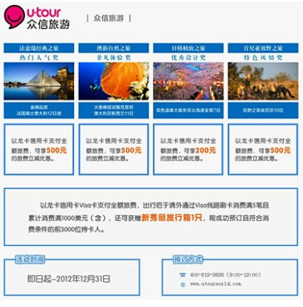 时间:2012-12-18 12:13:00 来源:kllv 近日,众信旅游携手建设银行为“龙卡信用卡”持卡人推出旅费“立减优惠”和“优惠随行”活动。双方通过跨界合作整合互有资源,为持卡人提供更为便捷、专业的服务,以及优质的产品线路和特惠价格。 凡通过众信旅游报名 “龙卡信用卡持卡人喜爱的“十大热门经典出境旅游线路”,以龙卡信用卡支付全额旅费,可享最高2000元立减优惠;同时以龙卡信用卡Visa卡支付全额旅费,出行后于境外通过Visa线路刷卡消费满5笔且累计消费满1000美元(含),便可享受优惠随行活动。