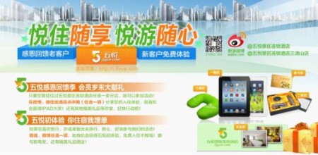 时间:2013-1-25 13:55:39 来源:kllv 记者从五悦景区连锁酒店获悉,自2012年12月15日起,为了回馈广大新老客户对五悦的大力支持,在2013年新年来临之前特别推出“五悦感恩回馈季,会员岁末大献礼”和“五悦初体验,你住宿我埋单”活动。 记者了解到,作为全国首家景区连锁酒店,五悦采用准四星的标准配置,舒适的住宿环境以及周到的服务,赢得了顾客的一致好评。因此,五悦特值此岁末之际推出了献礼活动。只要曾入住五悦景区连锁酒店任一家分店的顾客,在微博、微信或到到网、大众点评网分享入住体验,就有机会赢得免费房、IPAD大奖及其他的精美礼品。