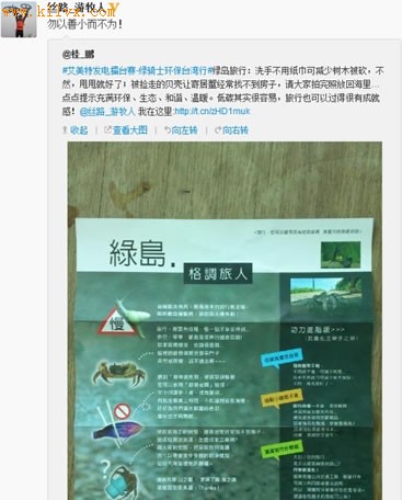 上海“绿骑士”车队微博记录绿岛环保宣传单 2. 从细节处进行环保 除了感叹台湾人对于环保低碳出行的热衷,上海“绿骑士”还对台湾当局在环保举措上的细致用心印象深刻,他们认为台湾处处体现了当地人们自幼形成的环保理念。 夜市的干净整洁是上海“绿骑士”对台湾的第一印象,跟大陆喧闹、脏乱的夜市截然不同。经营烧烤店的王阿姨向他们介绍到,保持夜市干净整洁是一种双赢,夜市干净整洁才能够让顾客吃得放心。王阿姨等店主们除了会自觉定期缴纳相关的排污管理费用之外,还会购买垃圾袋对垃圾进行分类打包。 初到台湾的海边,上海“绿骑士”不断感叹台湾的生态环境之好、海水之蓝、空气之清新、沙滩之干净。他们认为,美丽的环境和氛围也影响了来到这里游玩的人,海滩上也没有随意丢弃的瓶子、果皮、烟蒂等。 骑行过程中,上海“绿骑士”观察到很多景点只在个别洗手间放置垃圾桶。询问工作人员后了解到,此做法是为约束游客在游玩时尽量不携带食品、水以及其他不必要的物资,一方面可减少对文物的损害,另一方面也大大减少垃圾的产生。 【环保感悟】 在亲自感受台湾落实环保的方方面面后,上海艾美特“绿骑士”车队意识到,环保的氛围和干净的环境能够潜而默化地提高大众的素质和意识,进而造就一个整洁的环境。大陆除了要贯彻落实环保的政策,还需要在提高大众环保意识上多努力。 上海艾美特“绿骑士”车队——傲道先锋车队于2013年6月24日至7月6日,从台中开始骑行,途径嘉义、高雄、四重溪、太麻里、长滨、宜兰、新店、新竹等地。他们的环保梦想是:周游四方,在每个所到之处宣传环保,以自身行动感染他人,生命只有一次,地球也只有一个。 ——北京艾美特“绿骑士”车队在台湾的骑行过程中参与了垃圾循环利用的公益讲座并身体力行整理废品, |