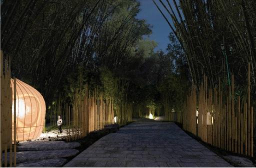 被竹灯点缀的竹园 大年初三走进演出的园区,你会被演出方的用心所打动。在这里你会感受到全新的团队用心良苦的设计。一个将现有竹林、树丛进行细致优化的全新长廊连接鼓楼群和山水主舞台,竹质编织小灯笼结构散布于游客步道周边,竹质长廊分布于丛束状竹林中,为游客提供步道以及遮风避雨的场所。长廊依赖并依附于竹林,既因为竹子是架构所需的必要素材,也是因为其所隐喻及代表的当地天然环境。长廊全部由不规则的手工编织竹体组成,其目的是在保持对园区自然条件认知的同时,使其更具魅力。 不只是文化长廊,整个园区灯光设置都紧紧围绕在创造核心情绪“欢乐”体验上。灯光是夜间最好的催情剂,园区的灯光布置,带给人不同的情绪感受,或梦幻、或震撼、或浪漫的视觉感知体验。园区筛选了符合自身调性的不同灯光元素营造全园氛围,并且巧妙运用灯光布景,形成白天、黑夜不一样的情绪,带给游客加倍诱惑!
