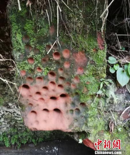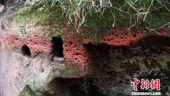乐山大佛景区内一处满是孔洞的红砂岩壁。 钟欣 摄 中新网客户端乐山2月9日电 四川乐山大佛风景名胜区管理委员会2月9日针对网上流传的视频进行回应,称视频中的岩壁位于乐山大佛景区北门栈道入口处,岩壁上的孔洞系天然形成,并非游客人为造成。 记者在网上流传的视频中看到,一处岩壁布满了密密麻麻的孔洞。视频中的一导游向游客介绍称,这里的山体是丹霞地貌,土质疏松,这些孔洞都是游人用手指戳出来的。视频中还有多名游客用手指戳进小洞旋转,还有游客边戳边喊:“转运、转运”。