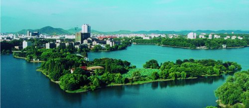 雨山湖及南湖、北湖公园景观的主要特点是绿草如茵,装点着各种乔木和灌木,形态各异的小桥、回廊和亭阁引导游人时而凌波赏荷,时而隔岸观景。