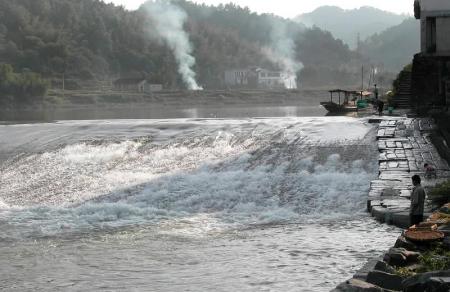 坝下乱石嶙峋,浪峰咬石;西岸巍然屹立 的紫阳山,林木葱郁;建于明代的紫阳桥,宛若彩虹横卧清波,此桥长140米, 高14米,宽10米,在歙县城的三座古桥中最高、最宽,因桥的上游即为徽商行舟的码 头,所以桥孔建得比一般桥要高大得多,以便行舟过帆。现渔梁坝已列入歙县申报世界文化遗产内容。