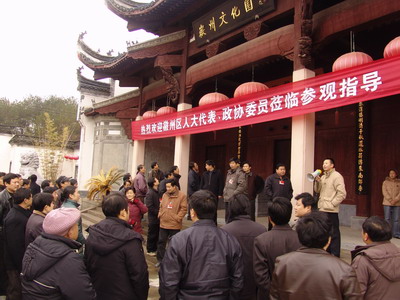 二000年一月十八日,徽州文化园一期工程建成,正式对外开放,主要景点有:充分展示徽派建筑风格的五凤楼、古徽州文人学子习文交友的文化活动场所文昌阁,让您踏上成功之路的折桂桥,汇集了海内外大家名笔名作的楹联、牌匾、黄山碑林和最能体现古徽州文化品位的牌坊群,以及荟萃了徽派盆景精华的徽派盆景园等。二期工程紫阳书院、徽商纪念馆、新安书画苑、古徽四宝斋、徽戏楼、徽菜馆、徽茶品茗阁、新安药堂等景区及徽州民居、购物娱乐休闲区正加紧建设,力争早日建成,对外开放。