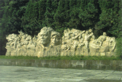 进入陵园后,沿台阶向上约三十米,是一个不规则的小型广场。正对面的挡土墙上镶嵌着叶飞同志题写的“皖南事变烈士陵园”字碑,点明陵园的主