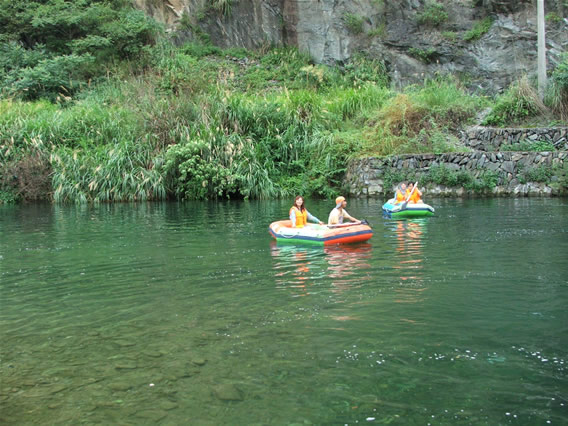 夹溪河漂流全程约5公里,乘皮筏顺流而下,两岸风景秀丽,群山环绕,悬崖壁立,林木繁茂,竹