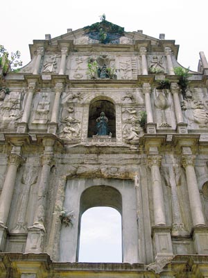 圣保禄教堂属圣保禄学院。天主教的耶稣会士早在1565 年已在圣安多尼堂侧建立起第一间会院,后又在大三巴山上修建新会院,并附设教堂和供讲授教理之用的学校。至1594 年,该学校升格为学院(当时的大学),成为远东地区最早的一所西式大学,这就是著名的圣保禄学院。 与圣保禄学院毗连的圣保禄教堂,创建于1580 年,于1595 和1601年先后两次失火,教堂焚毁。1602年开始第三次重建,现在牌坊左侧还存有当时的奠基石。整个建筑工程直至1637-1640年间才完全竣工;目前所见的教堂前壁就是最后落成的部分。1835 年,一场大火烧毁了圣保禄学院及其附属的教堂,仅剩下教堂的正面前壁、大部份地基以及教堂前的石阶。自此之后,这里便成为世界闻名的圣保禄教堂遗址。
