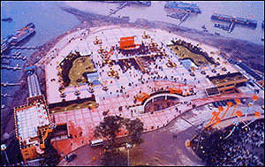 重庆水上门户朝天门,襟带两江,壁垒三面,气势雄壮。石壁上,藤萝垂青,黄角树穿岩抱石,绿茵融融。崖边古亭,飞阁临江。两排石阶,比肩而降,至抵下水。据说无论江水怎样枯竭,石级而下,无有穷尽,可通神秘的金竹宫。每值初夏仲秋,嘉陵江水绿,扬至江水黄,两水相交朝天门,撕咬翻卷,流急涡旋,向称“夹马水”,似如野马奔腾。江心有石矶沉浮,相传大禹在古渝州娶涂山氏女,此后治水13年不入家门。涂山氏女伫立矶上,望夫归来,因名“夫归石”。朝天门地扼黄金水道要冲,为重庆主要交通枢纽之一。1949年后,码头一再扩建,沿两江纵深排开。客运大楼拔地而起,客货缆车分道直通江边。两江索道,凌空飞渡,左右穿梭;江面客船货轮,铁驳木舟,鳞次栉比,此静彼动。重庆的繁荣昌盛,在一定程度上,集中表现在水上门户朝天门。