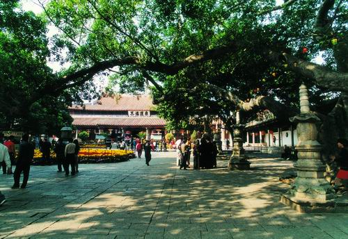 大殿后面的甘露戒坛,建在中轴线的第二台阶上。据说唐朝时候,此地常降甘露,一个叫行昭的和尚于是在这里挖了一口甘露井。北来天津三年(公元 1019年)在井上建坛,遂称甘露戒坛。南宋建炎二年(公元 1108年)敦炤和尚认为戒坛不符合规范,又按《南山图经》改建为五级,其间高低宽窄都有严格的限制。后经元、明多次重修,现存建筑是清康熙五年(公元 1666年)重建的四重檐八角攒尖式结构。坛顶正中藻井采用如意斗拱,交叠上收,如蜘蛛结网,似回纹织锦,结构复杂而精巧。坛之四周立柱斗拱和铺作间 24尊“飞天乐伎”,身系五彩飘带,手持琵琶、二弦、洞萧、响板,轻歌曼舞,翩翩若飞。它们与百柱殿的频伽一样,既是建筑艺术的瑰宝,也是研究南音与南戏十分宝贵的形象资料。 藻井下分五级。坛台的最上层供奉明代的卢舍那佛木雕坐像,其所坐莲花台座有一千叶莲花瓣,每片莲叶上各刻一尊 6厘米大小的佛像,十分精妙。卢舍那四周各层侍立着金刚钩、金刚索、金刚铃、金刚锁四菩萨,还有释迦牟尼、阿弥陀佛、寒山、拾得、千手观音的及韦驮天将等 24尊菩萨神像。其中尤以八大金刚塑像为最佳。它们怒目结发,赤足袒胸,显得无比威严。环绕坛座的束腰处还有护三皈、护五戒的各种神王牌 64个。戒坛是佛教徒受戒的地方,这种神秘肃穆的氛围,正可使人敬畏不迭,诸念俱灭,一心皈依。据说这种戒坛在全国已寥若晨星了。 戒坛之后,就是有“百宝楼”之称的藏经阁。这里原来是法堂,是元代至元二十二年(公元 1285年),僧录刘鉴义建造的。元、明时期已经过多次重修,至民国十四年(公元1925年)圆