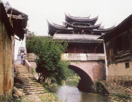 朝天似莲状而得名。桥内文化色彩极其浓郁,在桥顶斗拱,桥廊神龛以及80根桥柱桩上,绘有“桃园结义”、岳母刺字”等历史故事,花鸟壁画,楹联近百幅,艺术品百幅,艺术品位高,令人赞叹。桥内设有两条通道,其中一条用木栅栏相隔,宽约1米的边道过去专供妇女行走。这在福建众多古桥梁建筑中还是少见的,在桥的二、三间挂有风铃,遇风则叮当作响,村民们便根据是东边还是西边铃响来预测晴雨,颇为灵验。更为奇特的是,在桥孔中央石缝间还伸出两把黝黑的宝剑尖,据村民介绍,宝剑尖逢涝时能自动伸出,旱时则自动缩回5至20公分,实属奇观。  虹溪位于洞宫山景区中心麒麟岩下,长10余公里,宽约3米,令人惊奇的是,如此长度的储赤色河床,居然如刀削斧劈一般平