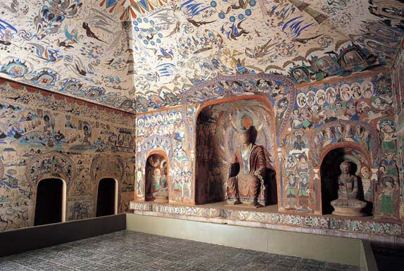 最古的地图《五台山图》大40多平方米。从一花一叶、神、佛,到表现当时当地历史人物活动的《张议潮夫妇出行图》,构图精细,栩栩如生。窟内金碧辉煌,绚丽夺目。画面如按2米高排列,可构成长达25公里的画廊,是我国现存规模最大、内容最丰富的石窟艺术宝库。