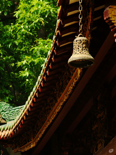 值得一提的是,花塔的根基很有特色。由于古时花塔濒临珠江(旧时珠江宽达2公里),地下水位较高,为了保护塔基,花塔的建造者们先沿着塔基,像打井一样用坚固的花岗岩石砌筑9个水井并相互连环依托,形成一个九井环基,然后在上面建造高塔。北宋和解放后重修时都发现了这个九井环基。经科学测量,现在的花塔塔身虽然倾斜了1.7米,塔基仍然比较稳固。 花塔外观十分漂亮,登上塔顶可以饱览羊城的秀丽风光。传说在南汉时期,皇帝刘()的宠妃素馨在六榕寺内削发为尼,中秋节之夜宫女们在塔上悬挂璀璨的花灯,方圆十里都能看到。可以想像,是何等的壮观! 大雄宝殿 六榕寺的建筑布局比较特别,花塔位于庭园中央,且在大雄宝殿的正前方。这保留了古印度早期佛寺以塔为中心的建筑风格,在中国 大多寺庙中较为少见。因为,自佛教传入中国后,寺庙建造有了变化,多数以大雄宝殿为中心,佛塔则建在中轴线的旁边了。 参观完佛塔,再到大雄宝殿参观。宝殿是佛寺的正殿,殿内供奉着三尊佛像,每尊高6米、重10吨,是省内最