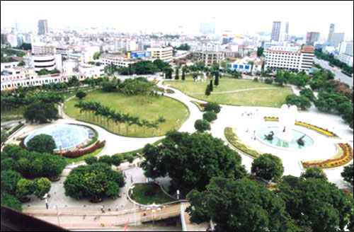 北部湾广场位于北海市区中心的北部湾中路、四川路、常青路交汇点,始建于1985年12月,原广场面积为2公顷,由来自全国6个较有影响的建筑规划方案,经评审清华大学建筑系的设计方案中标。市园林部门在设计方案基础上组织科技人员设计了配置方案,于1986年春对北部湾广场进行了植物绿化种植,按规划在广场内种上了龙眼、木棉、南洋杉、假槟榔等高大乔木坪。位于广场北面的一株古榕树是1986年清明由园林部门等17个单位约300多人的移植队伍用一天时间进行移栽的,将解放路原市政门前的一株树龄为120年,连泥带蔸约重60吨的古榕树移植到北部湾广场,这是北海乃至广西园林史上的一大创举。