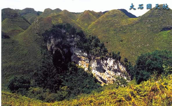 大石围位于乐业县同乐镇刷把村的北边,属红水河南端的干热河谷地带,经国土资源部岩落地质专家和岩溶洞穴专家实地考察论证,大石围的地下原始森林面积为世界第一,深度约为613米,居世界同类大型岩容漏斗第二,长约为600米,宽约为420米,其容积的0.8亿立方米,也处于世界第二位,有世界“岩溶圣地”之美称。