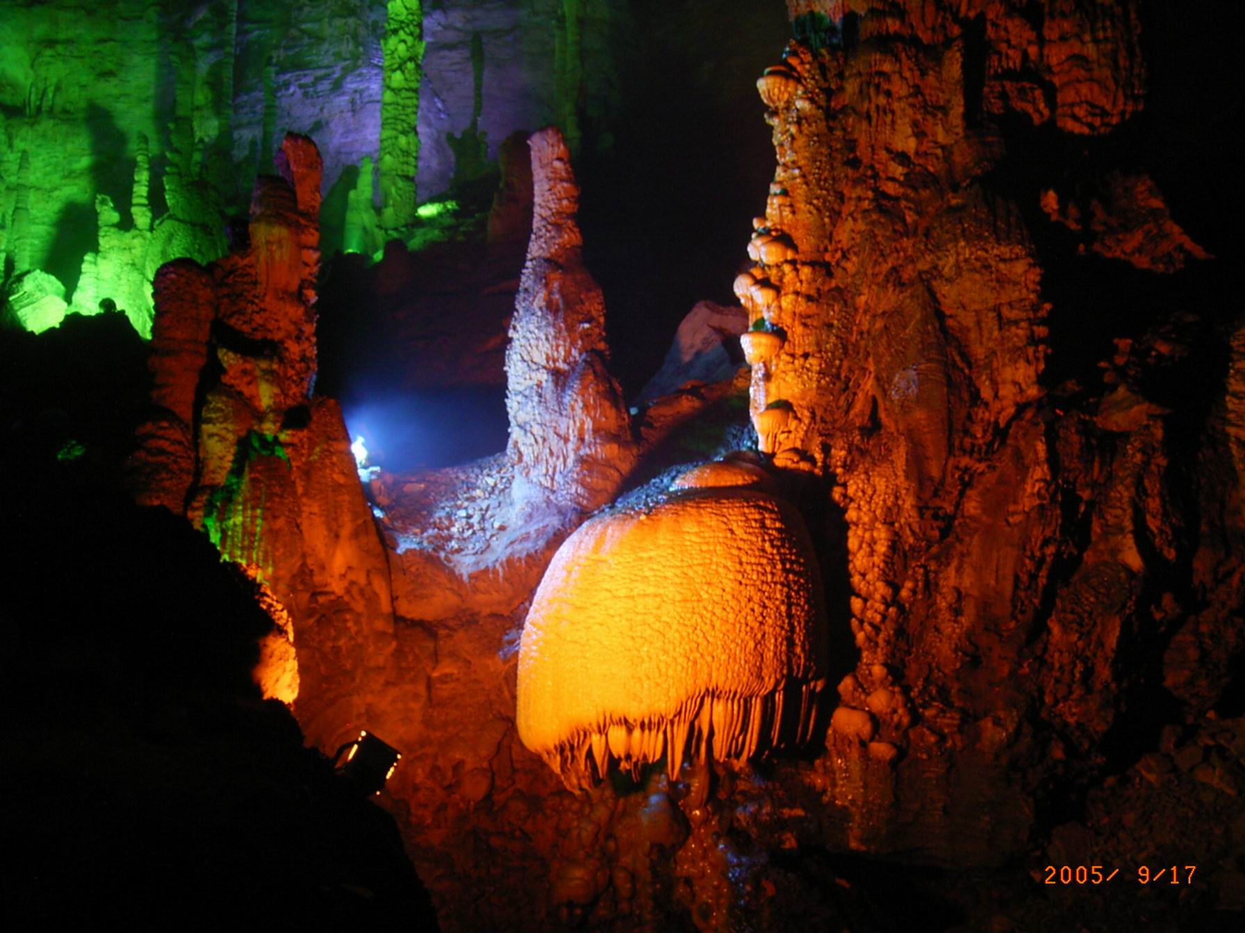 ,其中一突出者竟高达39.88米,周围16.4米,是我国目前开放洞穴中最高的石柱,为全世界第二高。柱身布满石花,如金雕玉镂,遂使三厅有如宫殿般华美庄严。“孔雀开屏”、“青龙盘柱”、“蟠桃献寿”、“金壁玉菇”、“龙虾出洞”、“醒狮怒吼”诸景纷呈,目不暇接。此外。石柱脚旁,又小景繁多:有的似猛兽在扑腾翻飞;有的象雏鸟欲展翅高飞;有如孩童围桌攻读;有若春笋破土而出。琳琅满目,美不胜收。洞中有一暗河,淙淙流水,清澈明净,冬暖夏凉,穿过洞底,流经洞前峭壁,成飞瀑急泻而下,如白练千尺,蔚为奇观。暗河可行走50米,时而涉水,进而踏礅,别有情趣。暗河右侧又一小洞,洞内“梯田”层层,岚光掩映,远近村落,依稀可见,景物虽小,兴味无穷。