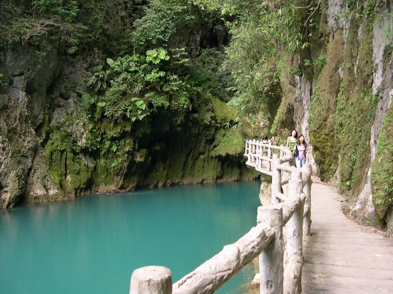 大七孔以进入景区的一座大七孔古桥而得名。充满了神秘、奇特的色彩。从大七孔桥溯流而上,迎面而来的是一道长长的天神峡谷,峡谷内危崖层叠,峭壁耸立,岚气缭绕。前行约1公里后,仰望左崖有一座高、宽各约100多米的峭壁直冲云霄,绝壁上附着朵朵钟乳、层层翠林,如同一幅色彩斑斓的油画。壁上还有三个自下而上的大小洞穴,洞口绿树丛生,情趣盎然。最为奇异的是,在这里不能大声呼叫,否则