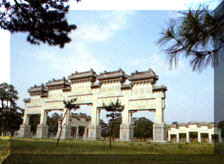 其中规模最大的雍正泰陵,居于陵区的中心位置,是西陵中建筑最早、规模最大的一座。其余各陵分布在东西两侧。泰陵的神 道,由三层巨砖铺成,两边苍松翠柏,从南往北分布着40多项大大小小的建筑。第一座建筑物是进入陵区的一座联拱式五孔桥,桥北有三座高大的石牌坊,巍然矗立。牌坊的建筑庄重、美观,色彩调和。这三座石坊,都是五间、