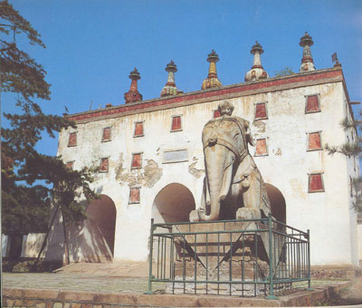 起戏台,面北,方三间,三层。大红台西北角建雕楼,实心,起装饰作用。群楼空井中心起万法归一殿,方七间四角稍间收进一半,重檐攒尖,上覆镏金鱼鳞铜瓦,四脊饰波纹,法铃宝顶。迎门摆法琅菩提塔,中供紫檀佛龛,内供弥勒,东西两侧置紫檀寿字塔。供桌摆八宝、五供、珊瑚树。靠北树屏风,前挂巨幅缂丝缎绣佛教挂像(高三丈、宽一丈),现无存。屏风前供释迦牟尼,再前供宗喀巴,大殿两侧供达赖和宗喀巴像,均为紫铜雕塑,质地精良,工艺精细,身段匀称,神态生动。殿内面北横额一为“净性超乘”,二为“妙德圆成”;面南横额“万缘普应”。殿内条幅有“狮座具神威咸钦奋迅,鹫风瞻相好普现庄严”;“法界朔中台臻大欢喜,化身现上塞护妙吉祥”;“总持初地法轮资福胜因延上塞;、广演恒沙梵乘能仁宏愿洽新藩”;“梵教流传宗递演,化身应现慧常融”。