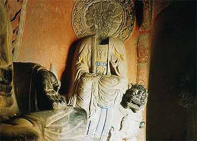 这种窟的形制基本上因袭了北魏后期龙门产生的三壁三龛窟(如龙门的石窟寺、魏字洞等)形式。 四壁设坛窟:分方形平面平顶(南四)和方形平面覆斗顶(南六)两种,这种窟的主要特征是四壁设环坛,坛上圆雕造像。正、左、右壁为一铺五身或七身组合,前壁窟门两侧坛上雕力士像。 这种窟形,在过去的研究中,也将它与三壁三龛窟划入一类,这种形式在北朝石窟中属于新样式。隋唐以后的龙门石窟才出现。 2、造像风格 从东魏武定末年至北齐后主高纬时期,尽管时间较短(约20多年),佛教没有多大的发展变化,但毕竟属于改朝换代阶段,统治阶