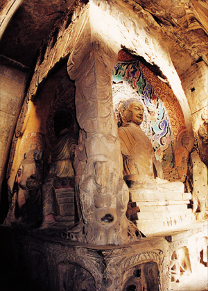 这时期佛的造像,形体敦厚结实,表现出北齐民族的强健和豪迈,面稍丰满,高鼻长目。结跏趺或半结跏趺坐于园莲座上,衣纹疏宕,成不规则阶梯状布于全身,佛衣下摆铺于座面。 菩萨的主要风格表现在浑圆敦实的体态上,其造型给人一种厚重之感,如南响堂第七窟内的菩萨,面相丰圆,体态健壮饱满,腹部略隆,衣纹华丽,上著披帛,下著大裙,裙裾贴体,作出水式,头戴宝冠,宝缯下垂至肘部。另外,北响堂第九窟左龛和南响堂第一窟左龛内的菩萨,充分表现出扭躯斜胯鼓腹,重心落于一脚的特点,以前者(北第九窟左龛)为甚,这不能不承认是开启了隋唐造像那种“浓艳丰肥”“细腰斜躯三道弯”的先河。 声闻弟子面型与菩萨同,体态浑圆,衣式简洁明快,下身也与菩萨相似,有“曹衣出水”之风。身体比例上略显上长下短。 3、雕刻技法 响堂山北齐造像雕刻技法,一方面继承了北魏的风格,一方面又创造出新花样。北魏时期的造像多用直平刀法,衣纹表现为阶梯式,给人一种纯朴、粗旷而又生硬的感觉。响堂山在吸收这种技法的同时,又使用了圆刀法进行混合处理,尤其表现在衣纹转折处更为明显,(如南七菩萨、北三菩萨)使造像的服饰趋于圆润