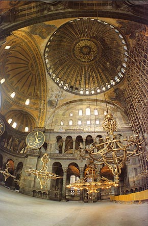 圣索非亚大教堂的特别之处在于平面采用了希腊式十字架的造型,在空间上,则创造了巨型的圆顶,而且在室内没有用到柱子来支撑。更仔细的说,君士坦丁大帝请来的数学工程师们发明出以拱门、扶壁、小圆顶等设计来支撑和分担穹隆重量的建筑方式,以便在窗间壁上安置又高又圆的圆顶,让人仰望天界的美好与神圣。由于地震和叛乱的烧毁,圣索非亚大教堂经历过数次重修,尤其公元532年查士丁尼大帝投入一万名工人、32万黄金、并花费六年光阴将圣索非亚大教堂装饰得更为精巧华美。神圣的教堂是当时的城市中心,而统治者对教堂所投注的心力不难看出统治者藉由对宗教的奉献、夸示帝国的权力与财富,而对周遭地区施与影响力的用心。圣索非亚大教堂的大圆顶离地55公尺高,而且在十七世纪圣彼得大教堂完成前,一直是世界上最大的教堂。