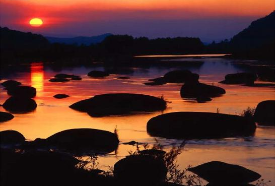 的低山丘陵靠近岸边,水波、树影;岗峦相互辉映,妩媚结丽。这一段江流之特点是:两岸全是原始植被,非草即木。所有岛滩,遍是蓊郁的柳林,漫江腾飞着鸥鹭野凫水鸟,水清流缓,即幽雅,且宁静。