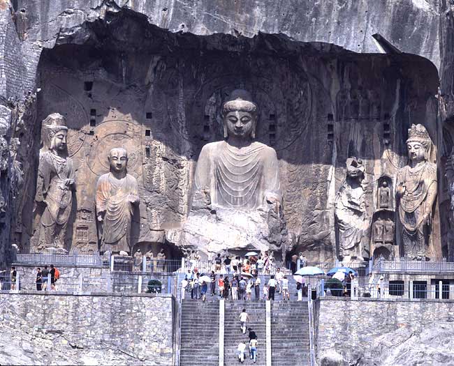 龙门石窟是我国四大石窟之一,位于洛阳市南郊13公里处。 龙门石窟凿于北魏孝文帝迁都洛阳前后(A.D.493年),嗣后历经西魏、东魏、北齐、隋、唐、五代的营造,从而在这里行船那嘎了南北长达一公里、具有两千余座窟龛和十万余尊造像的石窟遗存。这历时500多年的营造过程中,包含北魏和盛唐两个造像的高潮阶段。至今,保存在伊阙两山的这数以千计的像龛,绝大多数都是这两个时代的文化遗产。 在北魏时期雕凿的众多洞窟中,以古