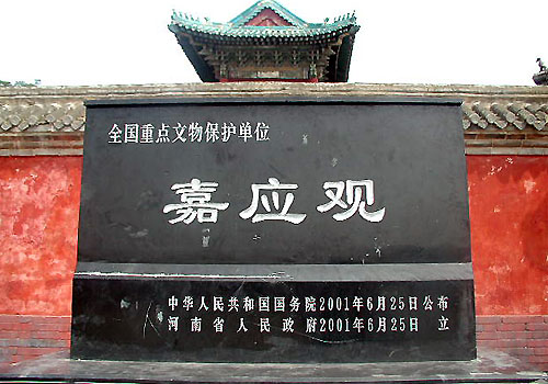 嘉应观位于河南焦作武陟县城东南12公里杨庄村南,建于清雍正元年(1723)年,是雍正皇帝为纪念在武陟筑坝堵口、祭祀 嘉应观现占地140亩,中轴线南北依次有山门、御碑亭、前楼、更衣殿、龙王殿、风神殿、雨神殿,东西跨院为河台、道台衙署。嘉应观山门为单檐歇山顶,顶部覆盖兰色琉璃瓦,檐下为五踩重昂斗拱,用材甚小,玲珑别致。外檐木质上均有彩绘,笔调明朗,色彩鲜艳。门前门牌上书有“敕建嘉应观”五个大字,为雍正皇帝手书圣旨。御碑亭似清朝皇冠,富丽堂皇,亭内御碑铁胎铜面,