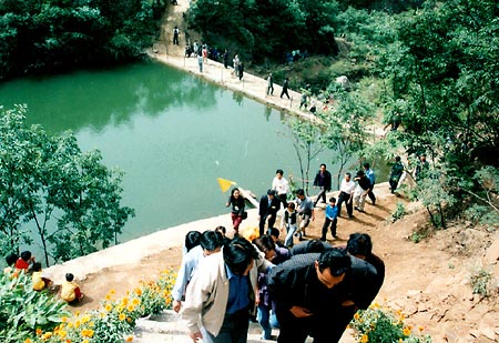 ![]() 猕猴驯化场是猕猴活动的地区。太行猕猴活跃在悬崖峭壁之间,善于攀缘,行动敏捷,是当今世界上进化最快的一种。九里沟这里共五群,约六百余只,它成群结队,游荡于茫茫的大山林海之中,虽是野生散养,但经强力驯化,现有三群猕猴可招之即来,与人同乐。 九里沟是天然的野生动物乐园,除猕猴外,还有受国家保护的一、二类野生动物如金钱豹、梅花鹿、香獐、相思鸟、红尾锦鸡、娃娃鱼、水獭等。 蟾堂,峡谷尽头,群峰壁立,石塞内一座小巧玲珑的瞻堂古庙跃人眼帘。蟾堂始建于唐,屡经修聋,是道教因山就势、自取形胜、天人合一、巧夺天工建筑的典