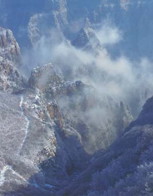站在紫金顶上俯视东南方向,山下群峰参拱,谷壑纵横,山中有谷,谷中有山奇特景观在此博览无余,太行山脉的蔚然大气尽收眼底,使人颇有山登绝顶我为峰、会当凌云顶,一览众山小之感,更会有一种指点江山、激扬文字、号令天下的谊迈气慨。再向西方极目远眺,群山边绵起伏,云雾蔼蔼,特别是傍晚时分,红霞满天,夕阳当歌,让人疑是海外仙山。