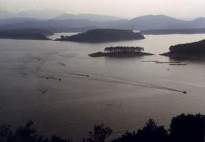 薄山湖是一个狭长的山谷湖泊,山环水绕,绵延25公里,如果从天空向下俯视,薄山湖像一条腾飞的青龙,酣醉于青山峻岭之间。湖两岸有十万亩森林,覆盖景区山峦、岛屿,环绕湖周。薄山湖景区由朗陵景区、大坝景区、东大山景区、九子沟景区国部分组成。今天我们游览活动主要安排在湖上,其间我们要游览湖心岛、毛竹林、九子沟,游湖还途经灵龟岛、"绿色长城"、大钩潭、禹王治水、处、骆驼岩、将军壁、猴儿崖等,整个游程约15公里,需要3~4小时。