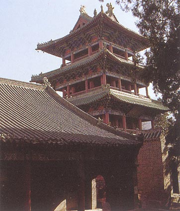 山门为一殿,面阔三间,雕脊彩瓦,吻兽生动,系清雍正十三年(1735)所建。门上“少林寺”横匾原悬于天王殿,兵火后移此,为清圣祖玄烨亲书。殿内有弥勒佛坐像和韦驮护法神像各一尊。山门后甬道两旁立有唐、 二进院为天王殿。该殿与四进的藏经阁和三进的大雄宝殿均被毁,现已重修好,内有四大天王像。三进大雄宝殿于1986年重建。殿内柱基均为雕刻高1米多的石狮。藏经阁遗址前后,除钟楼遗址上放重