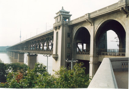 与武汉长江大桥一并落成的武汉长江大桥纪念碑和观景平台,他们与武汉长江大桥相互依偎,碑高6米,重20余吨,南面镌有毛泽东同志“一桥飞架南北,天堑变通途”的诗句,观景平台则是游人赏长江、看大桥的最佳位置之一。 武汉长江大桥凝聚着设计者匠心独运的机智和建设者们精湛的技艺。八个巨型桥墩矗立在大江之中,米字形桁