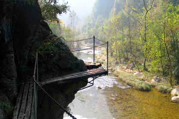 ![]() 到达山岩狭窄处,便可弃舟登岸,沿着河岸汲水前行,眼前突兀耸立一座石峰,山峰如苍龙望天,昂首挺胸地把守在龙门之处,这就是镇峡门神,传说进此峡谷,必先拜门神,方可保你一路平安,百事不生,否则你将心神不定,被峡谷神秘阴森的景象所惊吓生病。这河神高5米有余,石顶的杂树象龙须一样生长着,杜鹃花开着粉白花象蛟龙的牙齿,石峰下是一潭静静的绿水,潭水清沏见底,潭底鱼儿戏耍,须尾可见,游人们只能顺着独木桥进入龙门,恰似进入龙的肠道肚一般,使人感到胆颤心惊。两岸峡谷,岩画迭出,“白马岩中出,黄牛壁上耕”,谁能看得懂,“云山依依看皆美,竹树萧萧画不成”,哪个能破译?攀过悬乎乎的“手扒岩”,逆水而上,萎萎的芳草,艳艳的野花和错落有致的腊梅花树,一路相随,太阳透过山峰照在五龙河上,折射出一串串神奇的光环,各种鸟儿此起彼伏地演奏着“五龙河”旅游曲,使人感到极度舒坦。 转过一道山嘴就看到了雄伟的“母子山”。一座高大的山峰的脚下偎依着一座小石山,大小山峰形状相同,小山峰耸立在两条山沟的交汇之处,又象一座威武的将军把守在三岔路口,交汇处有