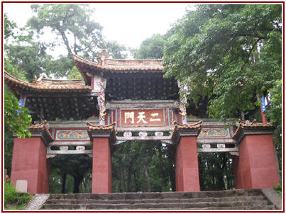 ![]() 2.古铜殿:位于天柱峰前小莲峰上。元代大地十一年(公元1307年)铸,高3米,阔2.8米,深2.4米,悬山式屋顶,全部构件为分件铸造,卯榫拼装,各铸件均有文字标明安装部位,格扇裙板上铸有“此殿于元大德十一年铸于武昌梅