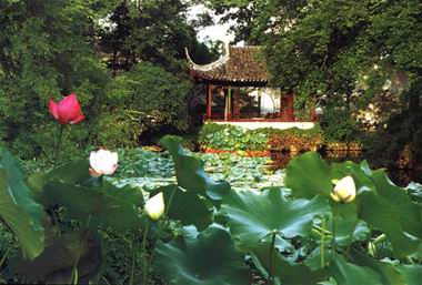 (1)因地制宜,以水见长。据《王氏拙政园记》和《归田园居记》记载,园地“居多隙地,有积水亘其中,稍加浚治,环以林木”,“地可池则池之,取土于池,积而成高,可山则山之。池之上,山之间可屋则屋之。”充分反映出拙政园利用园地多积水的优势,疏浚为池;望