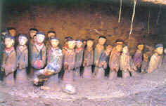 六号坑,坑内有少量的骑兵俑和陶马。这些俑坑俨然是一支布局紧凑、合理的地下军阵:三列主力纵队分为两列,前列是排列密集的步兵前锋,后面是浩荡的车兵方阵,在主力“锋”阵中间的制高点处,站着四匹膘肥体壮的战马,其后站着一位形象威仪的将军俑,它是这支部队的指挥官,身后簇拥着一队甲士俑,构成军阵地指挥中枢;距主阵右侧不远处是由两条骑兵俑组成的轻骑兵方阵,形成军阵的右翼,古代军阵锋、本、卫、翼