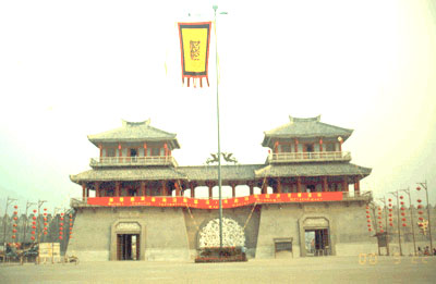 个建筑和28座雕塑精品所组成,是一处典型的再现汉代风格的大型仿古建筑群。内部分为四个景区:皇宫区、皇城区、市井区、演武区。皇城区由未央宫、长乐宫和建章宫三座相连的宫殿组成。皇城区、市井区、演武区三个景区设有供游人参与的仿古娱乐景点:四台、一坛、一阵、一树。