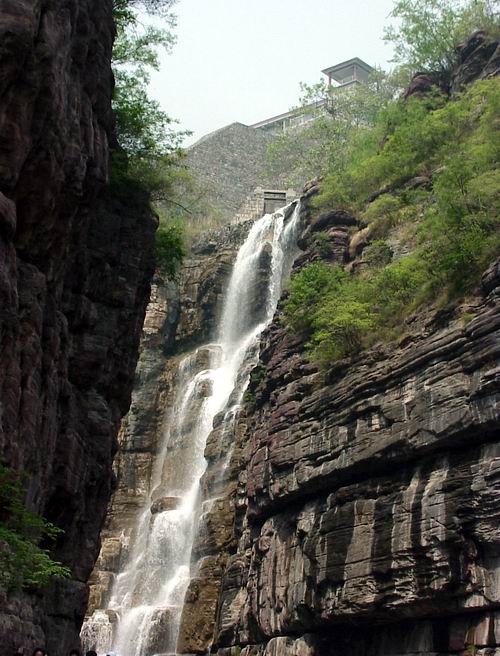 船山位于行城东侧,古为舟船避风之处,因而此名。山上有“阎王壁”、“帘洞”、“滴水崖”三折瀑布,统称“船山飞瀑”。 暴雨过后来到船山,老远就听到瀑布冲击山谷发出的轰轰巨响。登上半山腰红柱金瓦的“观瀑亭”,举目眺望,瀑布全景尽收眼底。飞瀑沿山谷奔流,半山的云烟随涧水浮沉,*瀑布在涧谷中时隐时现。 遥看最高处,宽约3米的流水,从第一道悬崖——“阎王壁”上垂直奔泻而下,落差50余米,仿佛白练垂挂,因此,这个上瀑又叫“匹练悬空”。