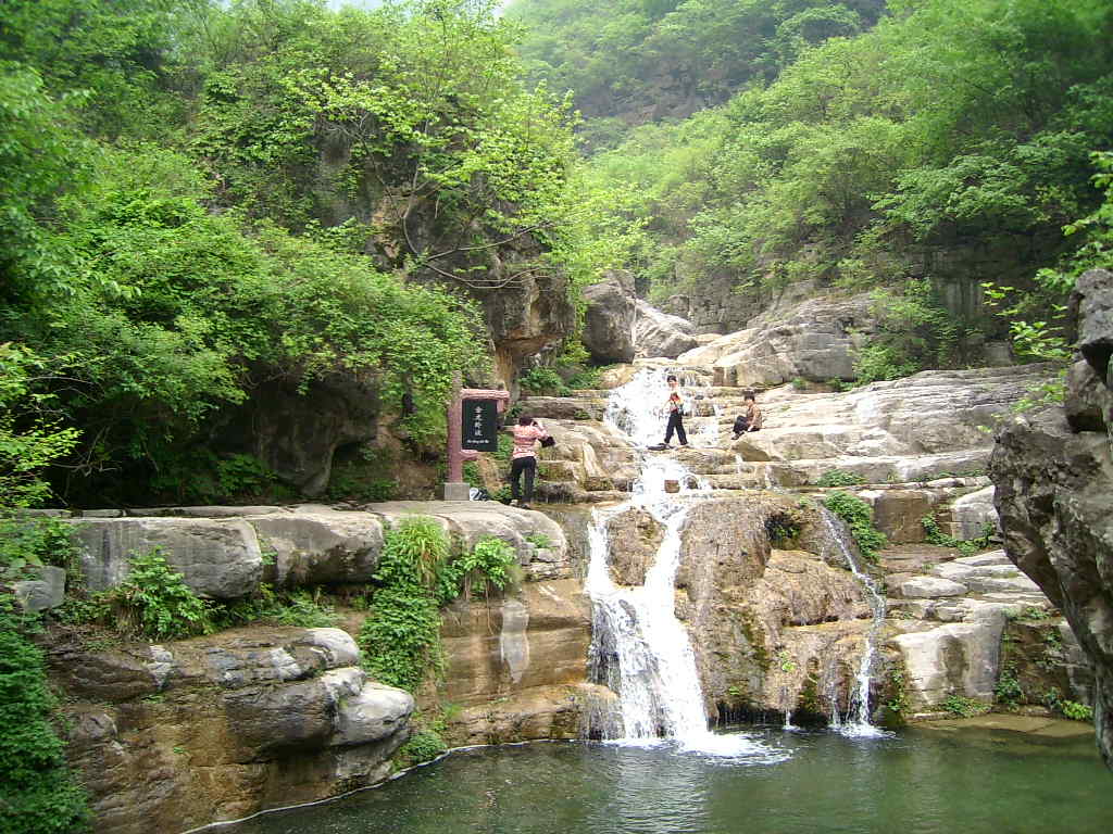 涧水约行200米,就到了下瀑——“滴水崖”了。滴水崖高10余米,宽20余米。岩石直立如壁,涧水到达它的上方,成了一匹横展的白练,飞瀑垂虹,寻浪纷飞,声如轰雷,山鸣谷应。崖下北端,有一天然石洞,大如房屋。它是由裂隙形成的人字形岩洞。洞中可坐可卧。从洞里向外望,洞顶瀑布变作无数细流,宛如亿万珍珠缀串的门帘,晶莹夺目。人们把这个下瀑,叫做“嗽玉喷珠”。