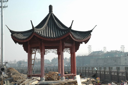 ![]() 却金亭建在盐课司街南即盐市口处,这里便成为古代阜宁的一处名胜,以后的各种版本的《阜宁县志》及有关史书对却金亭均有翔实记载。到了清朝初年,却金亭由于年代久远而坍毁。但此后仍不断有人前来参观游览。清