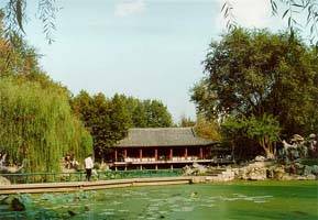 。沿着二十多级台阶攀登进入枣红色的大门,跨入快哉亭幽静的小院,亭楼主体建筑座落正中,古式敞廊环绕相连,显得层次分明。院内的配房、花坛、太湖石河各色花木,交错别致。院门外台阶下的石板路、小桥,直通对面仿古建筑逍遥堂。小桥东西大面积的荷花池中,凉亭、水榭、曲桥相通。春夏之际,荷花妖娆,清香四溢,占地七十多亩的快哉亭公园,已成为闹市区中安静优美的景点。